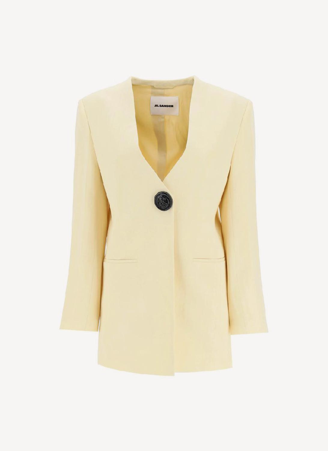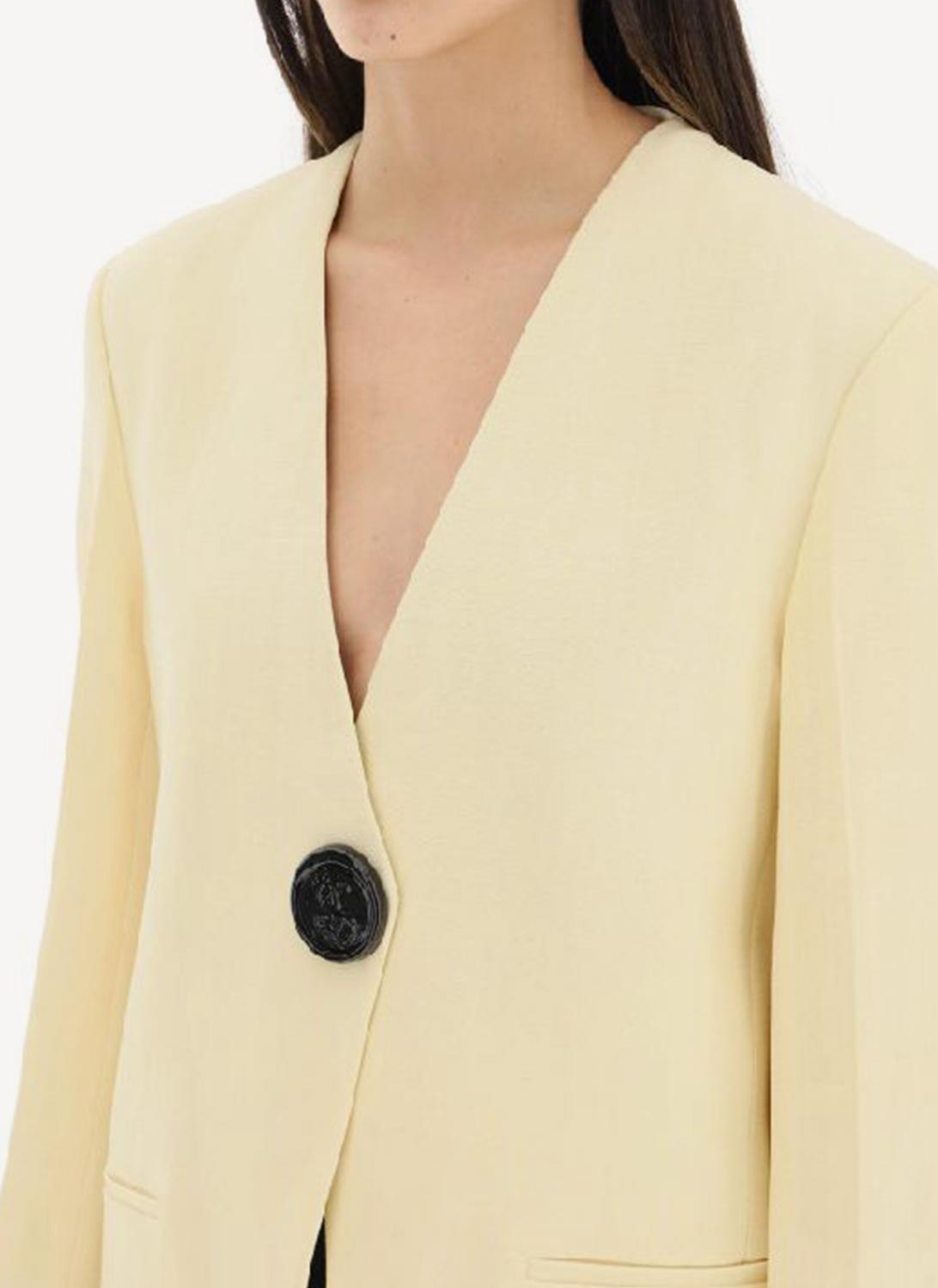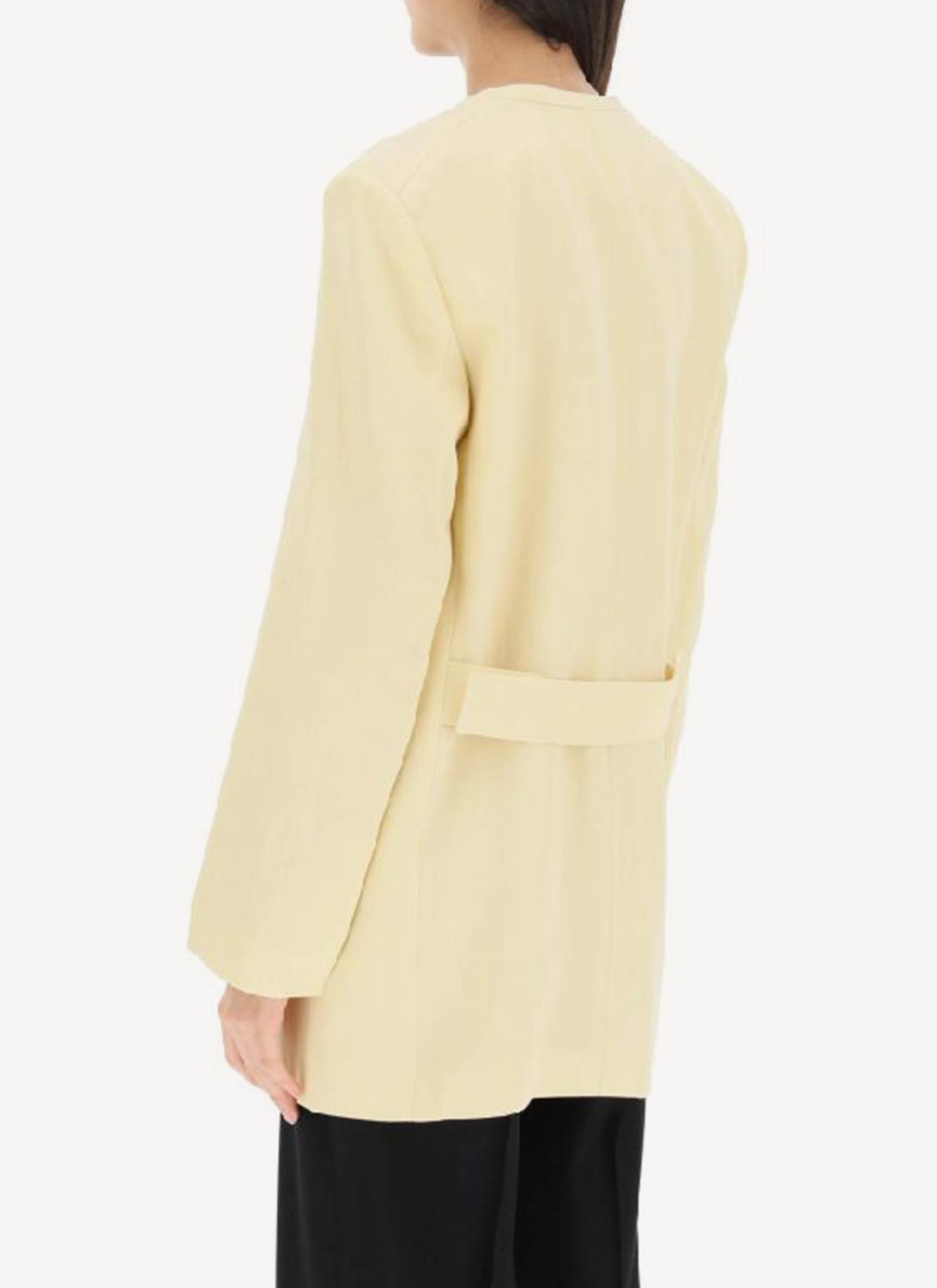 Blazer col en V à simple boutonnage de couleur jaune butter. Coupe décontractée et droite, ceinture dans le dos. Poches passepoilées fendues à l'avant, Fentes aux extrémités des manches.