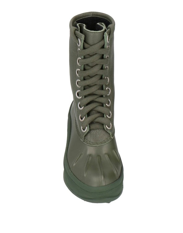 Bottes militaires à lacets et bout rond couleur olive, en cuir, ces bottines à lacets reposent sur une semelle en caoutchouc et présentent une languette arrière et des surpiqûres sur le devant.