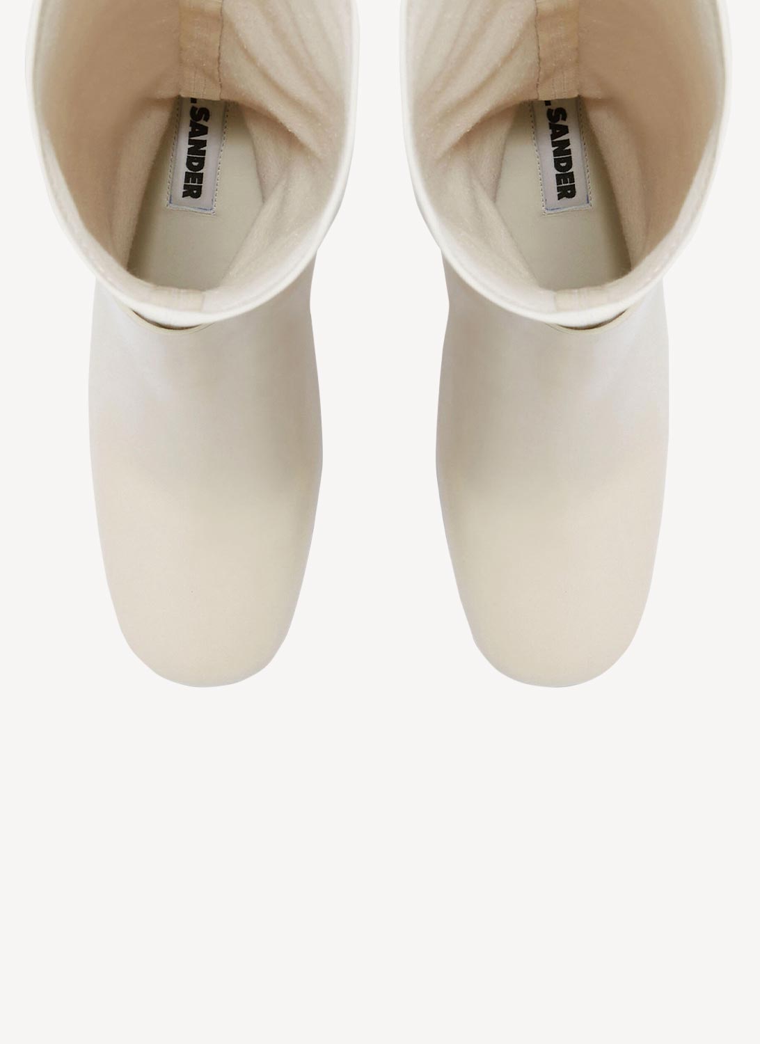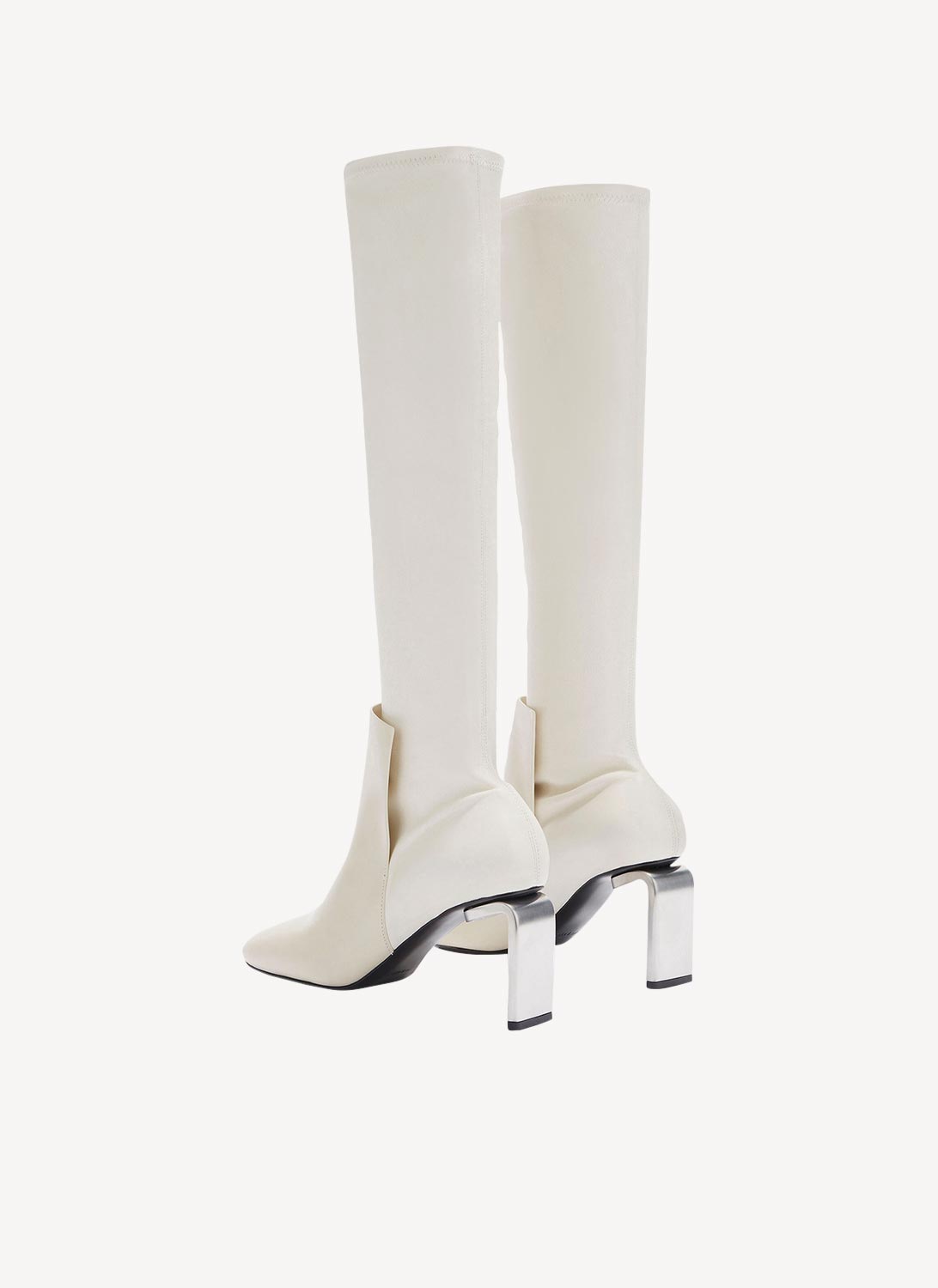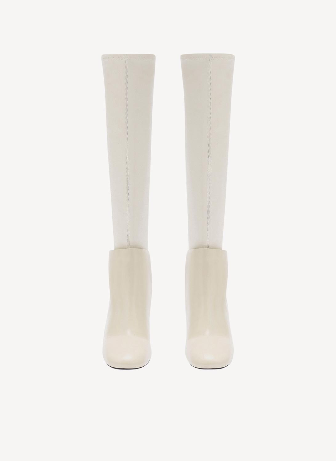 Bottes en cuir blanc et beige, doublure en cuir, arrondies, semelle en cuir. talon géométrique en métal, Tige cuir et toile stretch.