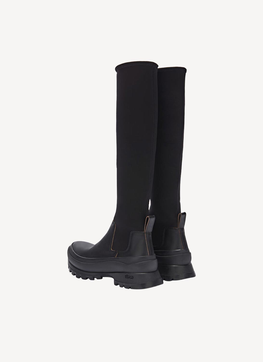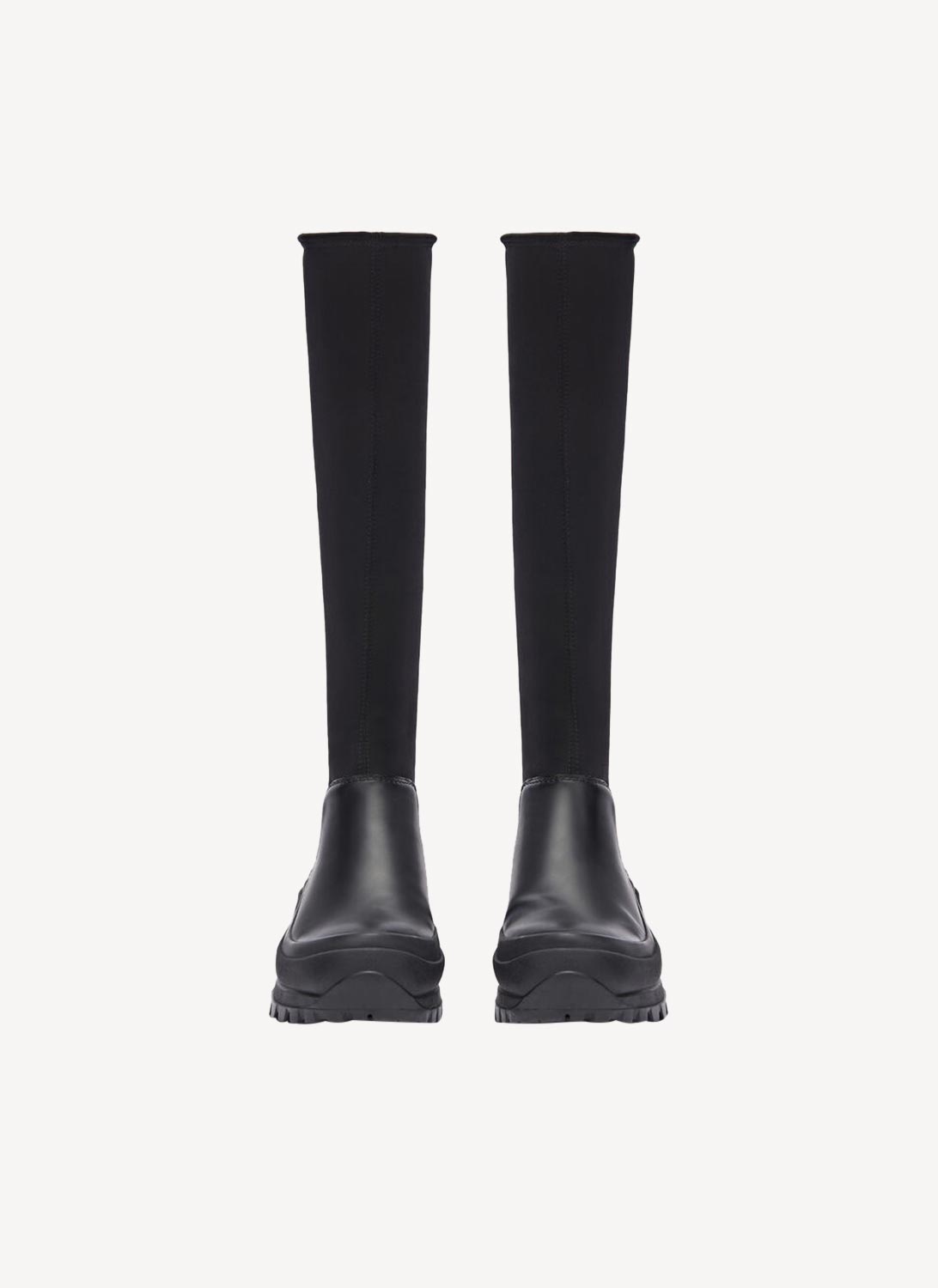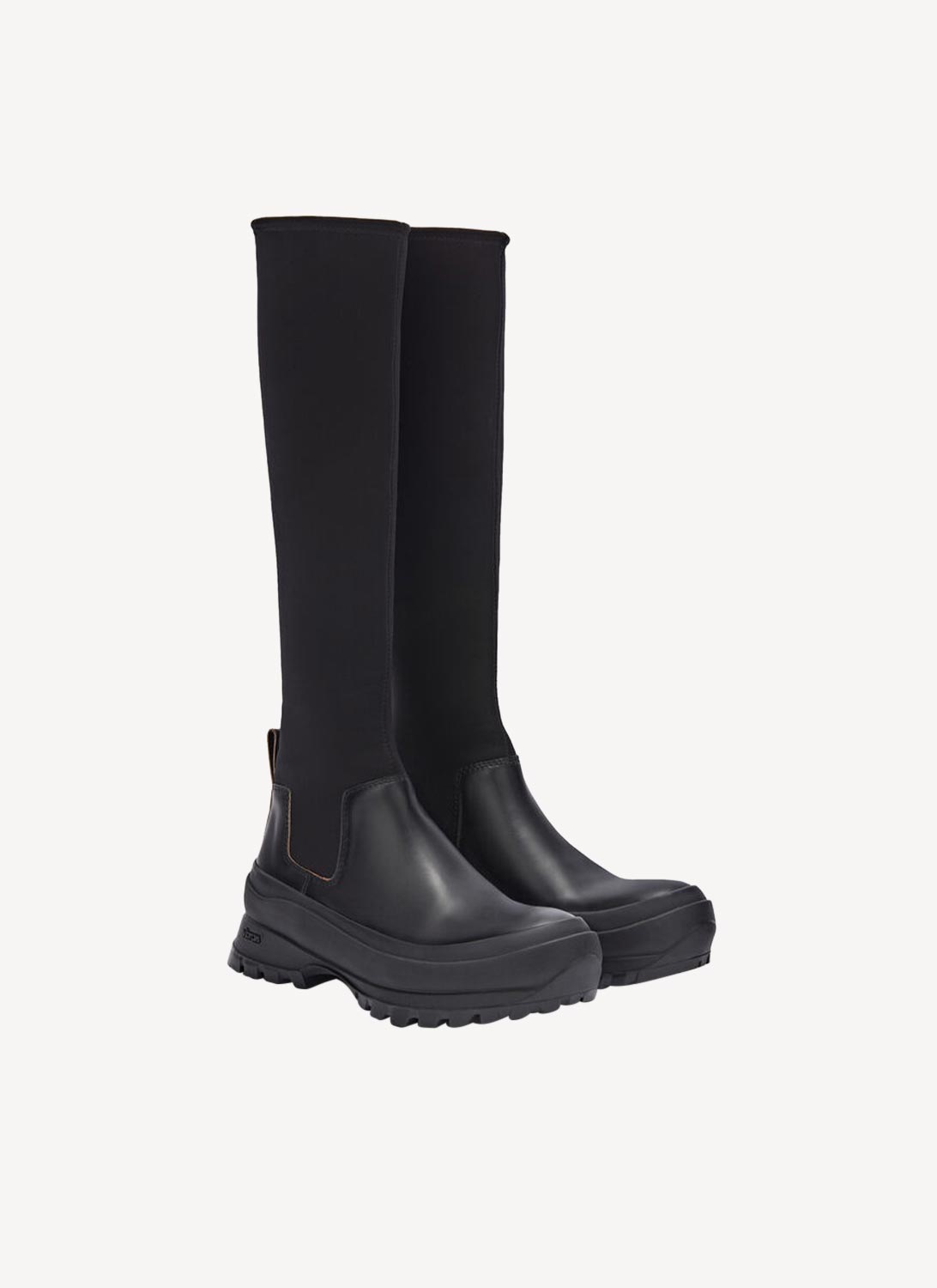 Bottes hautes en cuir et daim noir, doublure en cuir, arrondies, hauteur du genoux. Semelle en caoutchouc.