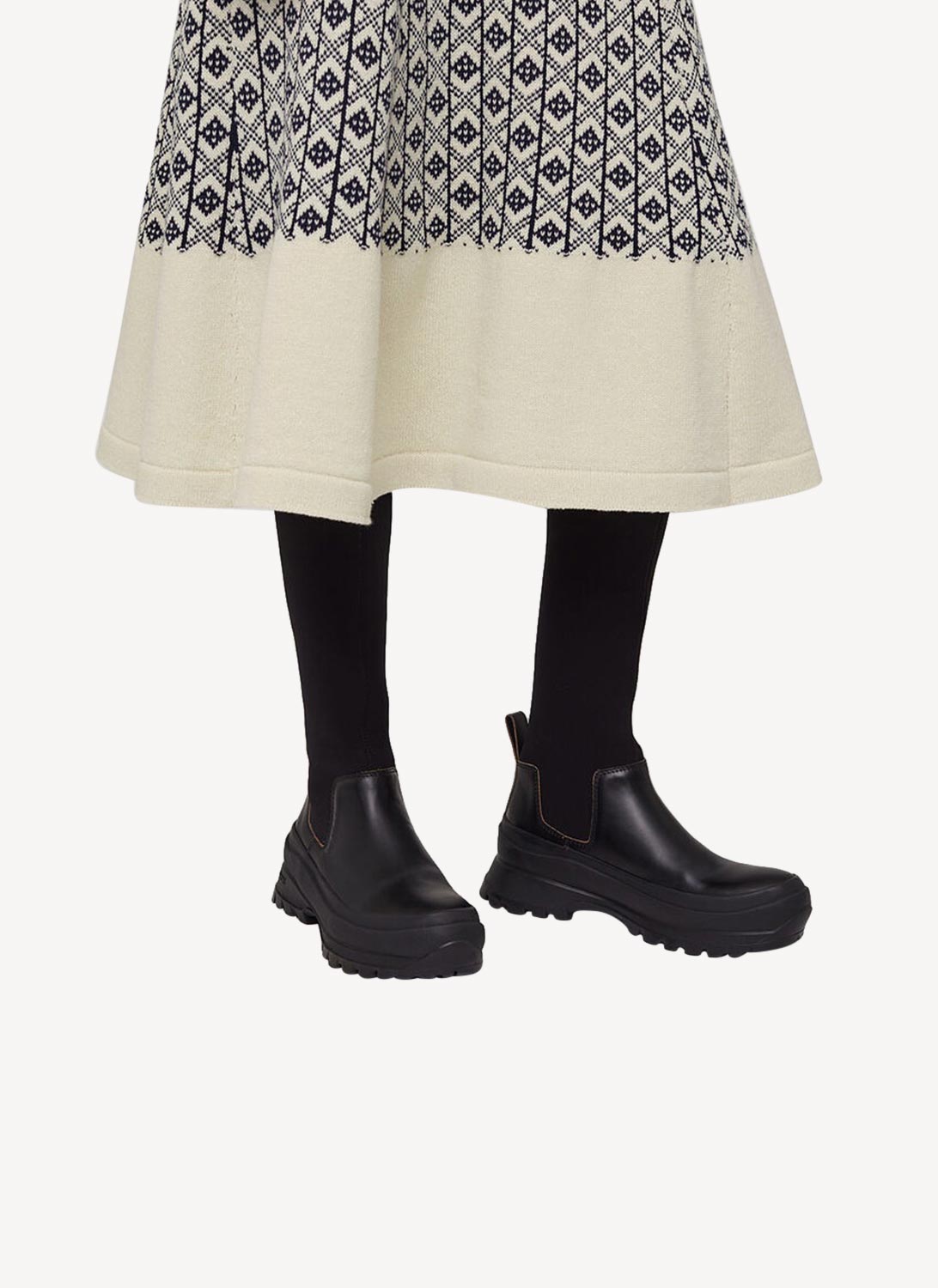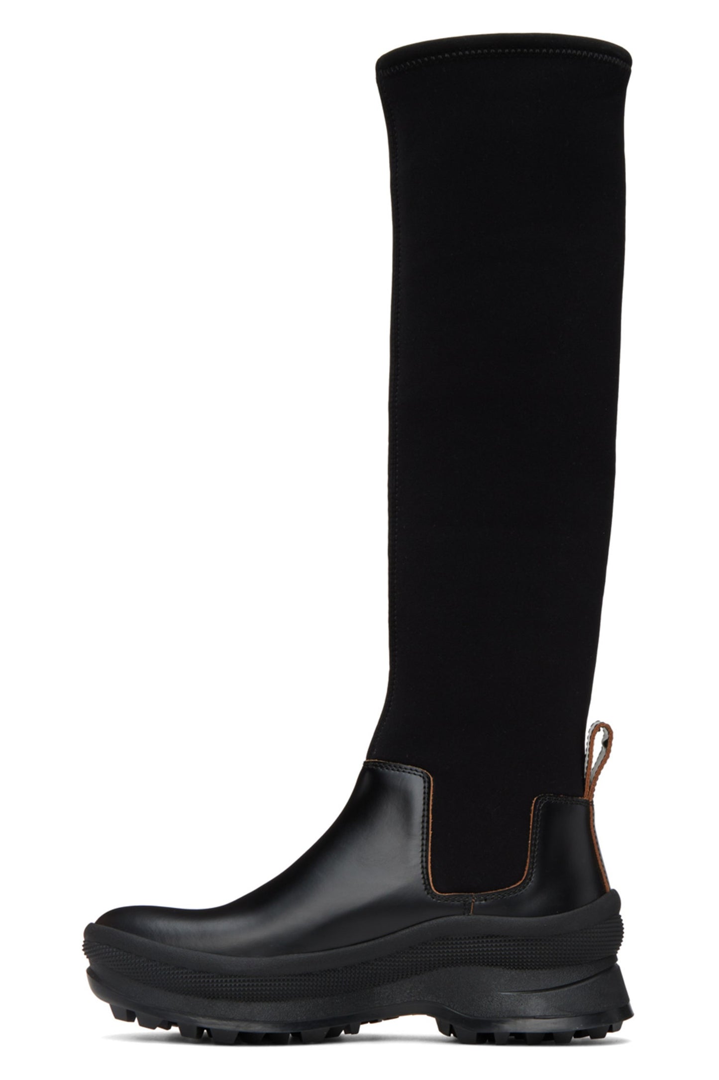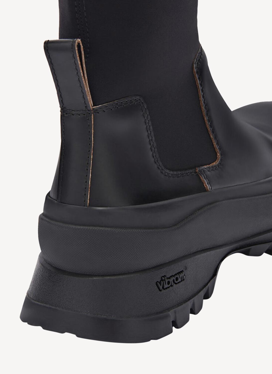Bottes hautes en cuir et daim noir, doublure en cuir, arrondies, hauteur du genoux. Semelle en caoutchouc.