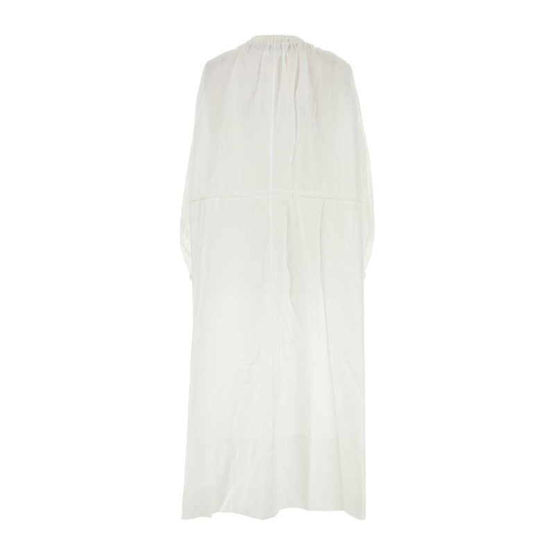 Robe couleur blanche ceinturée à la taille. Col ras du cou, lien de serrage. Manches longues, poignets resserrés, poches latérales et fente sur le côté. Taille grand.