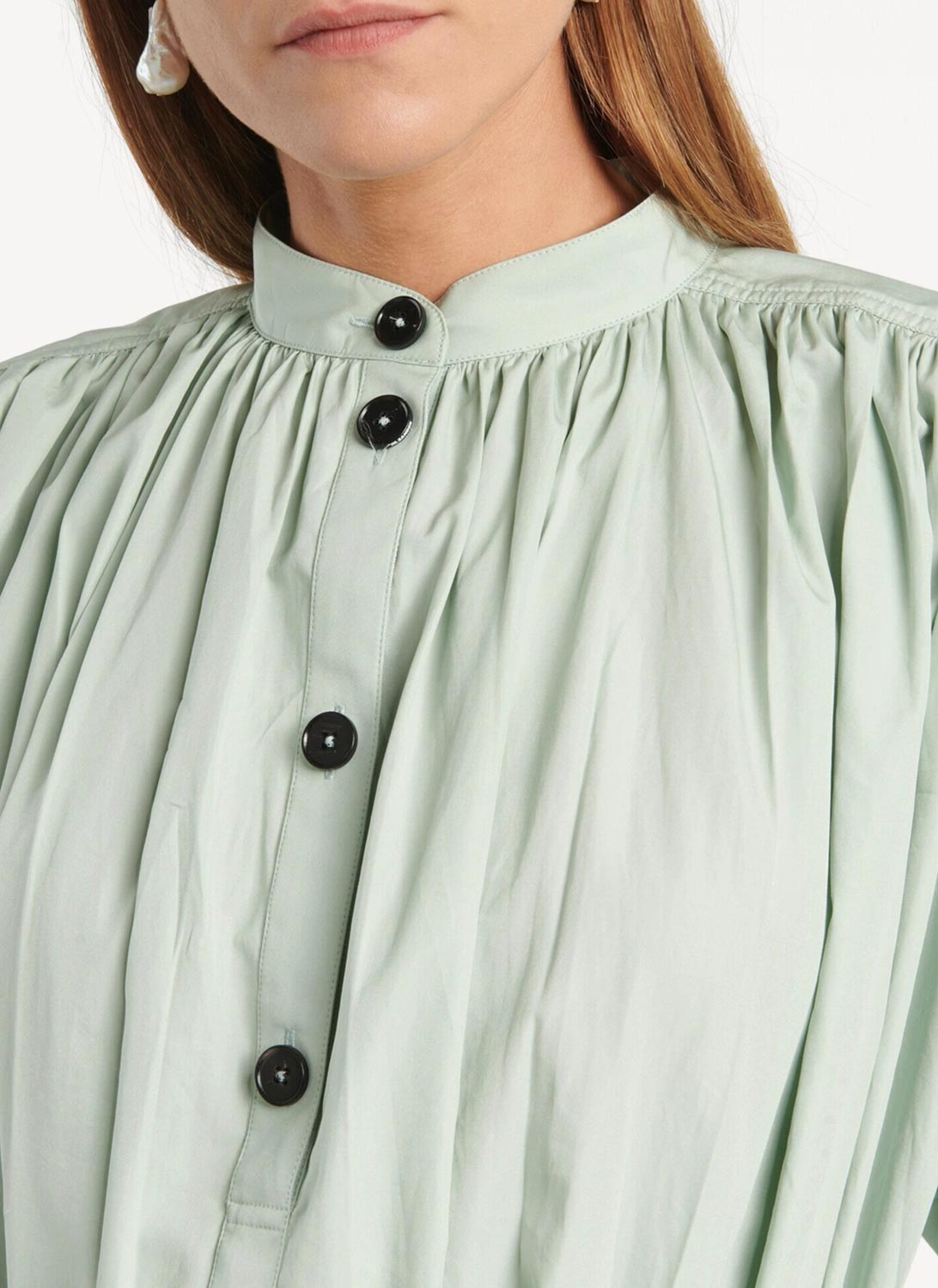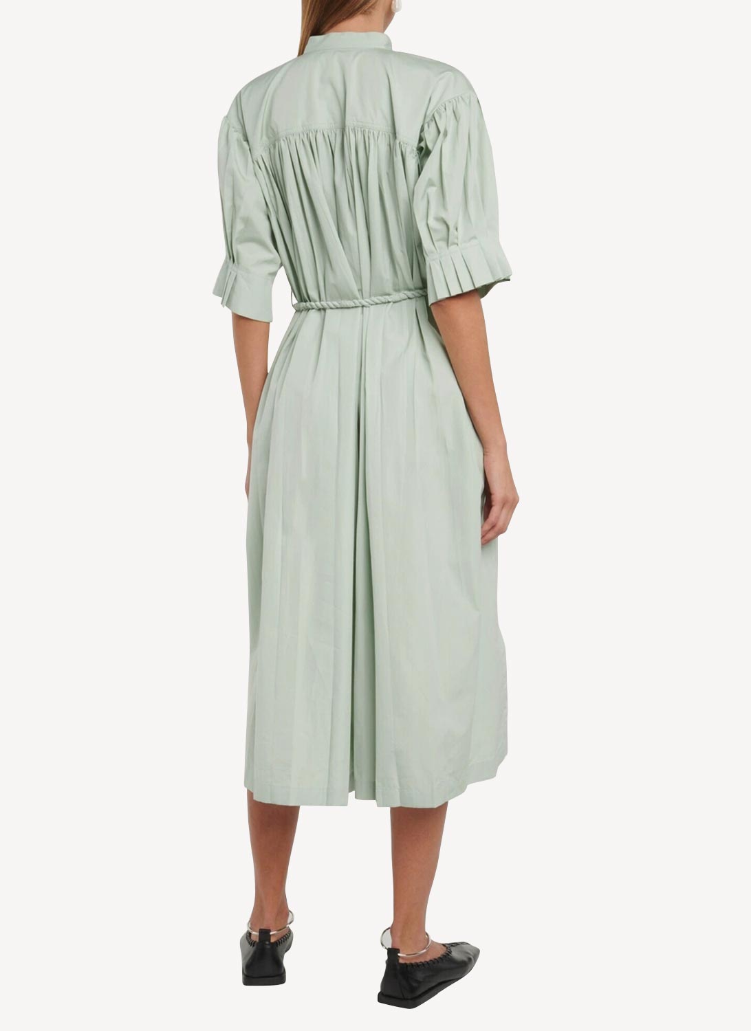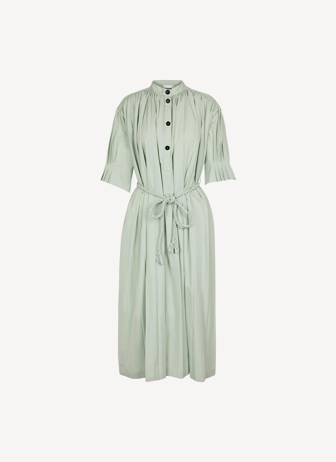 Robe vert menthe ceinturée à la taille. Col ras du cou, boutonnage sur le devant. Manches longues, poignets boutonnés, poches latérales et fente sur le côté. Taille grand.