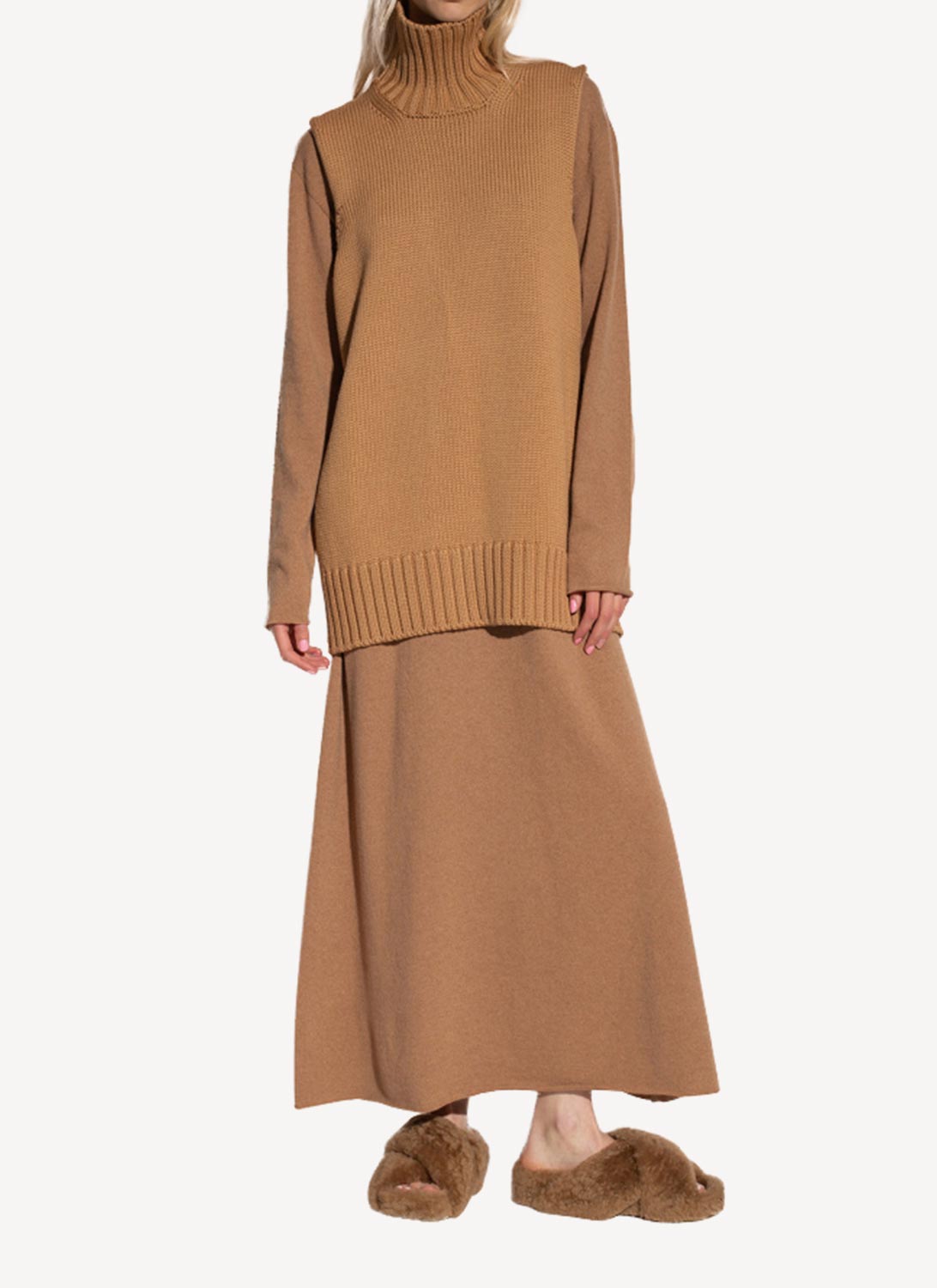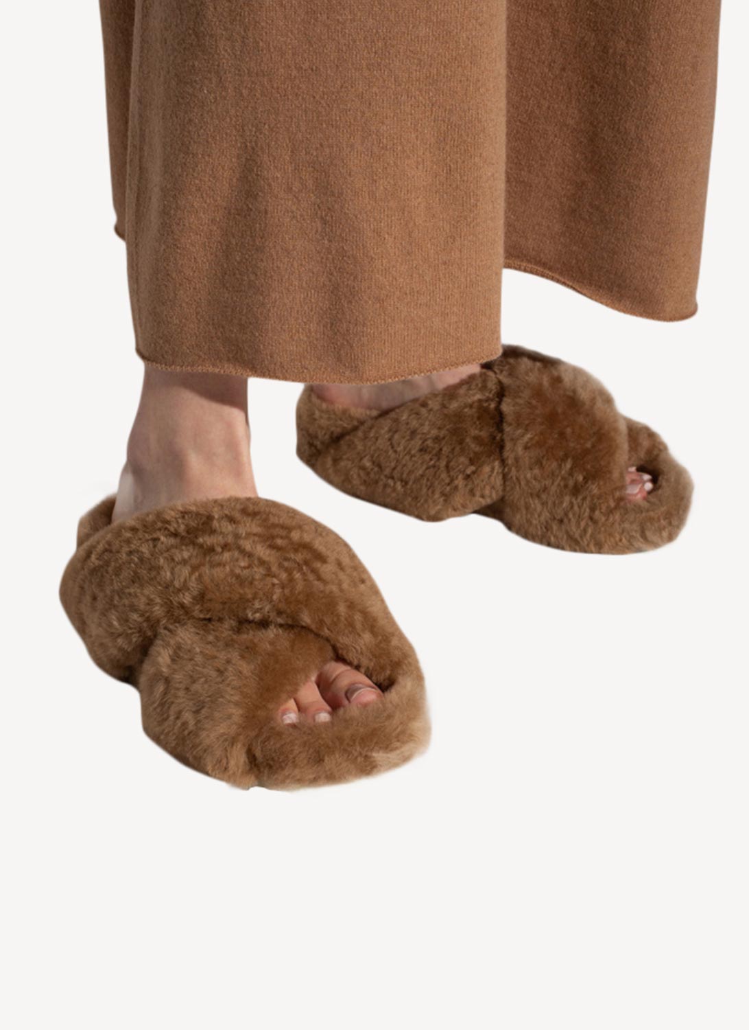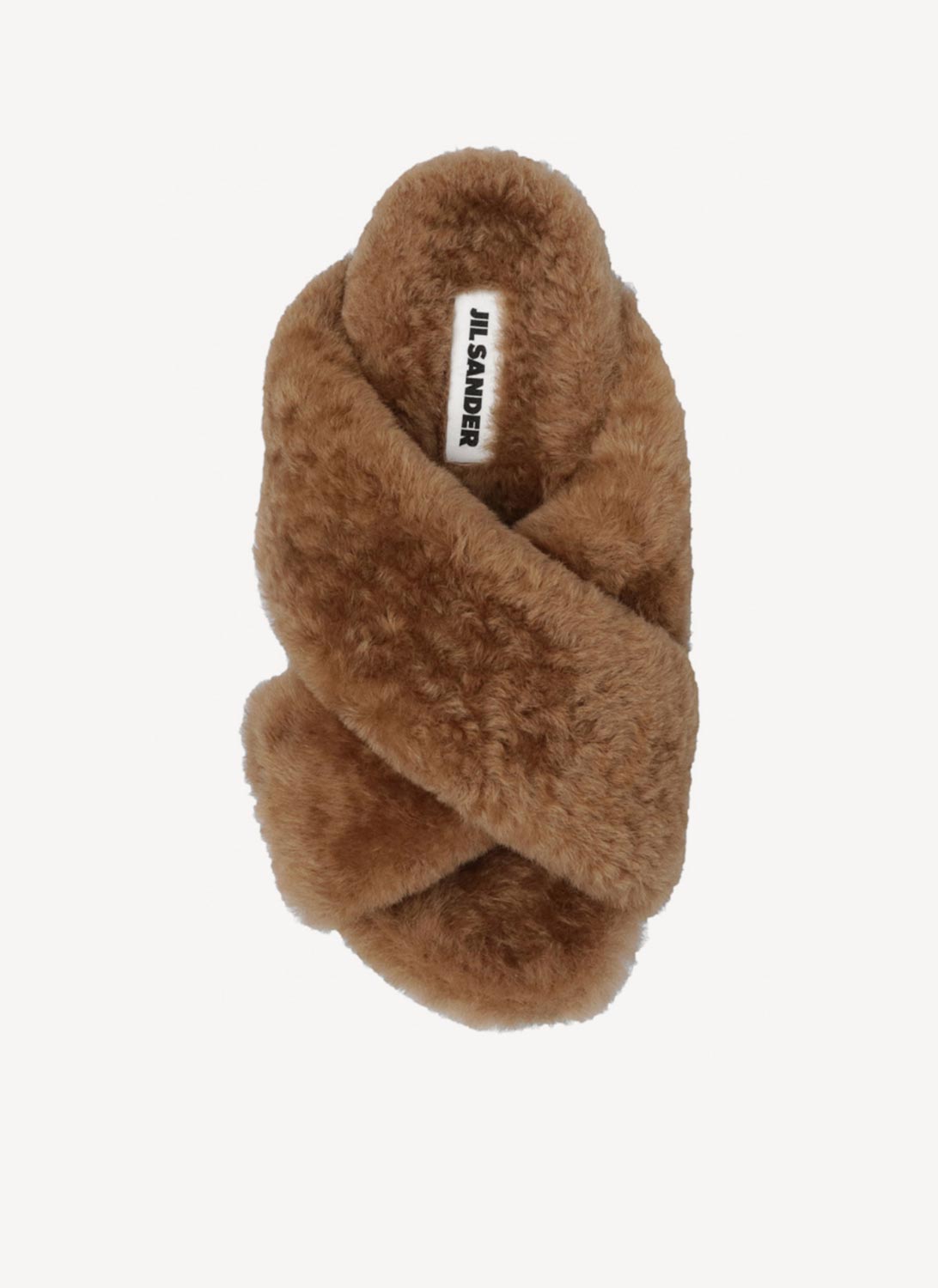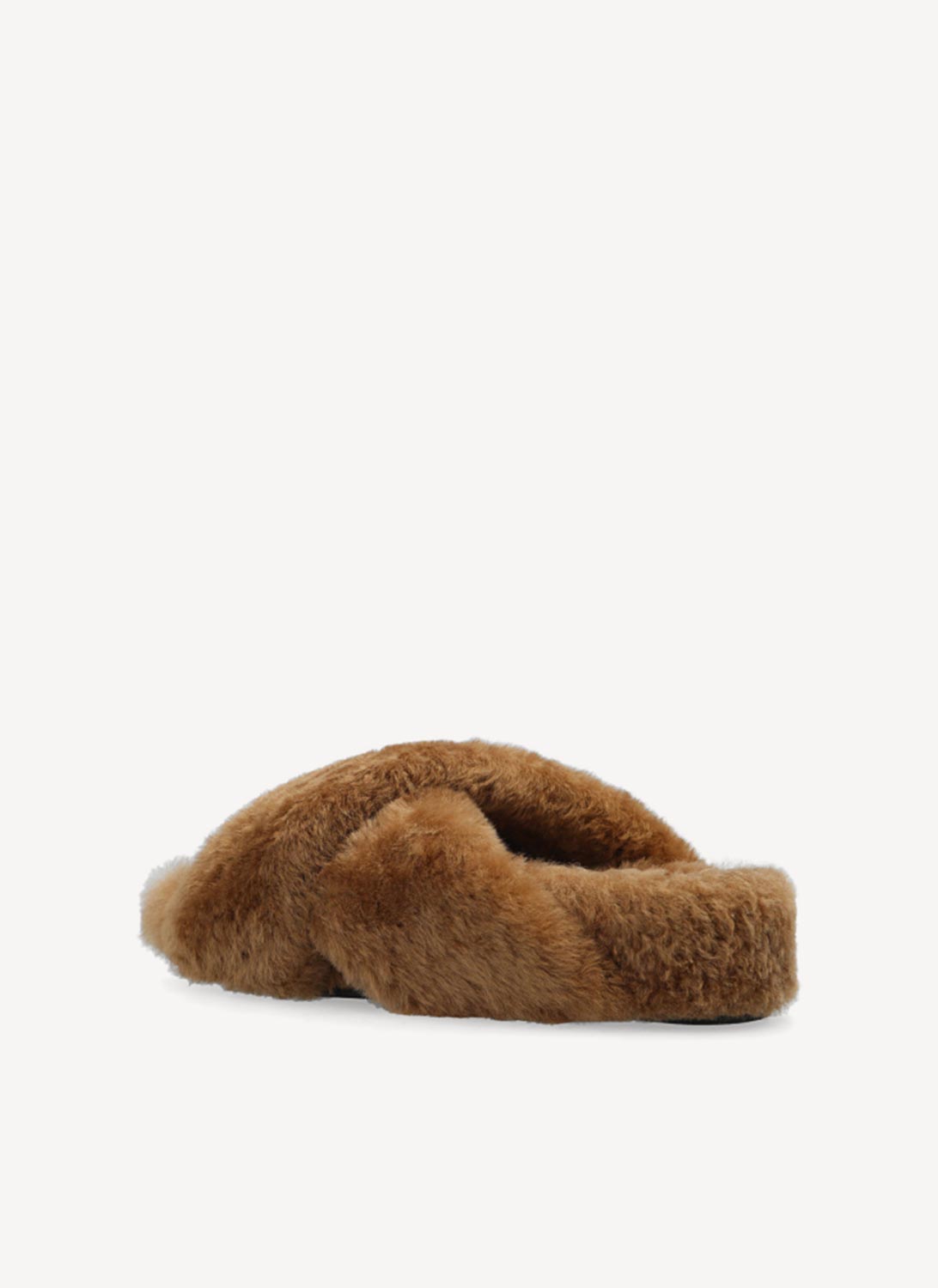 Sandales en peau lainée de couleur capuccino. Ce modèle en fourrure présente des brides croisées et une semelle en cuir noir.