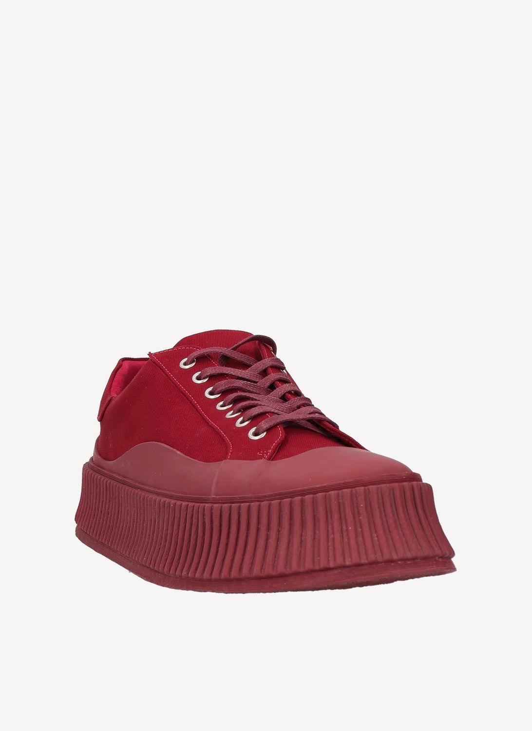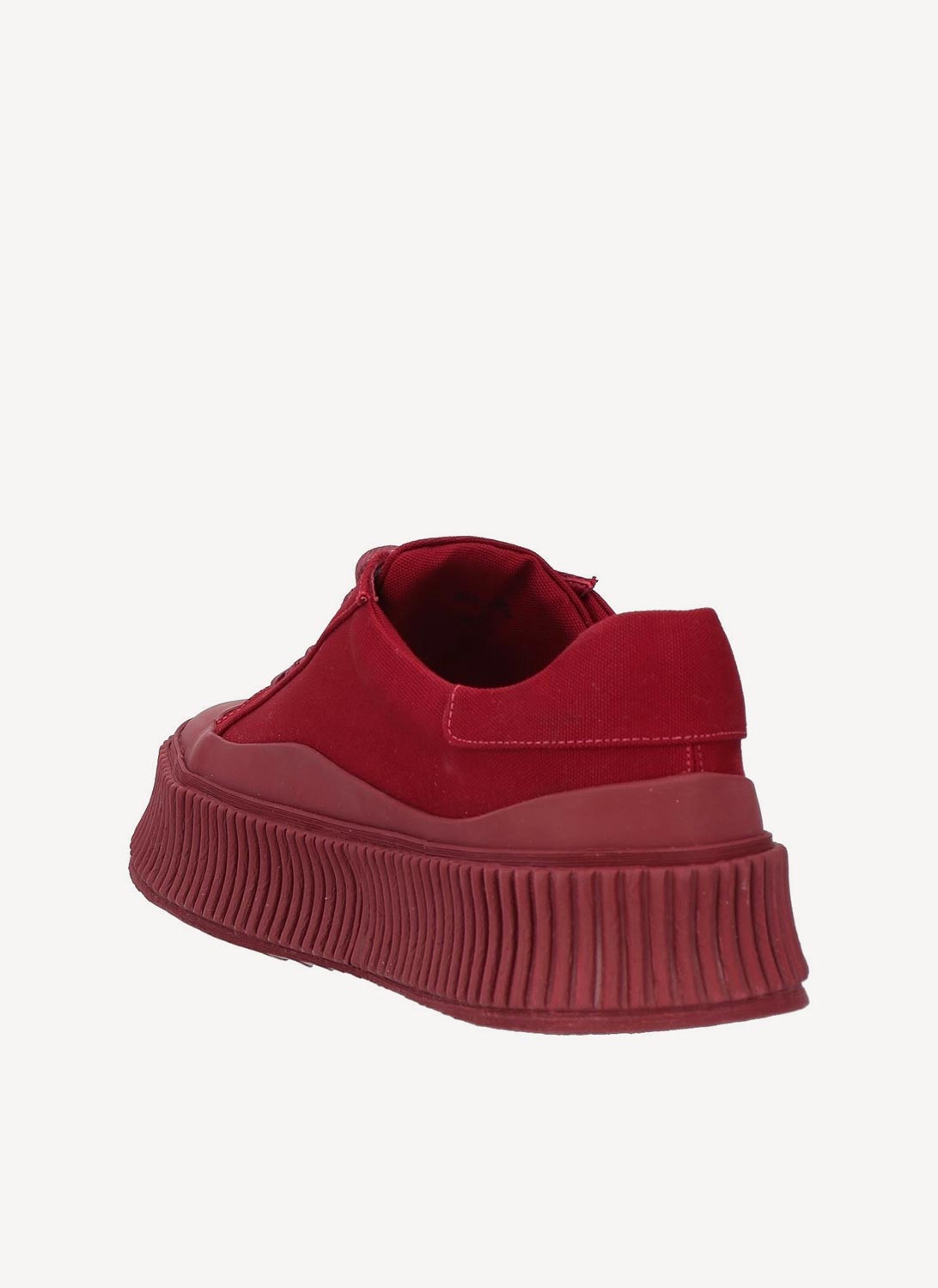 Baskets basses à lacets en toile rouge, bout rond, embout en caoutchouc, semelle épaisse en caoutchouc.