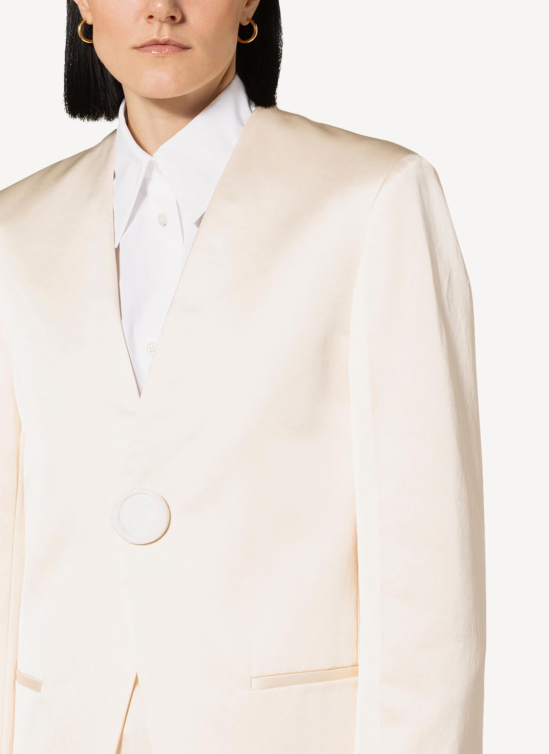 Regular price €514,00Blazer col en V à simple boutonnage de couleur latte. Coupe décontractée et droite, Languette avec boutons-pression à l'arrière, dans le dos. Poches passepoilées fendues à l'avant, Fentes aux extrémités des manches. Brillance subtile, sensation douce.
