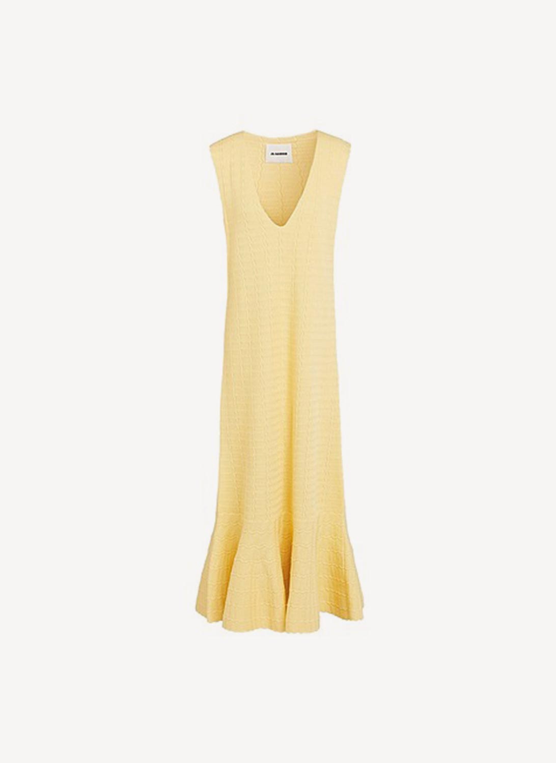 Robe évasée en maille crochetée, maille de poids moyen, sans appliqués, couleur unie, encolure profonde, sans manches, non doublée, sans poches.